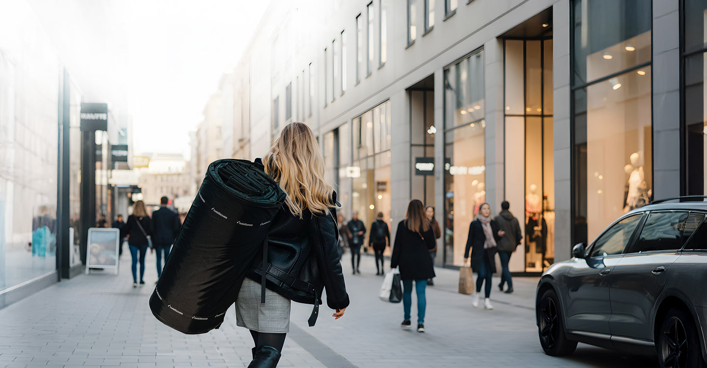 Because it rolls into a compact form, storage becomes effortless. No garage hooks. No ceiling lifts. No need for extra space. It is the only full-size roof box you can pick up as a parcel and carry home in its own compact packaging.